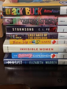 So it’s that time again. The time where I have too many books checked out from the library and I’m unable to read them fast enough. I’ve got one in transit now and the two on top are due in three days.